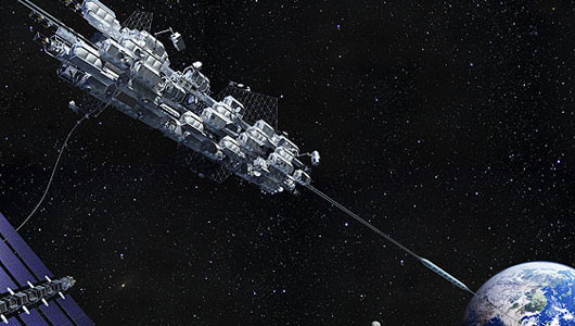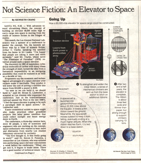 Type 1 Space TechnologiesThe Space Elevator![]() The basic idea behind a space elevator is to tie a tether between the earth and an orbiting artificial satellite, then use the tether to transport things from the ground into space. ![]() ![]() The biggest problem with engineering and building a space elevator is the material to be used for the massive 15-20 mile long tether cable... For this Engineers are thinking of using carbon nanotubes. From a space elevator platform we will then be able to construct larger space station platforms, which can act as future shuttle ports, or space hotels. Space RampsA massive rail-gun up the side of a muntainFrom Sky Ramp Technology Mankind needs an inexpensive method of launching spacecraft. For the past 48 years, the basic method has been multi-stage expendable rockets. There has always been great interest in a single-stage Reusable Launched Vehicle (RLV), to allow ordinary people to visit outer space for the same cost as a trip to Europe. In fact, today's "Space Shuttle" was envisioned as a single-stage RLV, but that proved impractical so two semi-reusable rocket boosters and massive disposable fuel tank are needed, which pushes the total cost for each mission over $500 million. As a result, hopes for 100 shuttle launches a year have dwindled to four a year. NASA canceled a more recent attempt at a single-stage RLV, the X-33/Venturestar, when problems proved insurmountable. The solution is a "Sky Ramp" assisted-launch to propel an RLV on a sled to supersonic speeds up a long inclined track before the RLV fires its engines. This can be done with today's rocket engines or pneumatic accelerators at less than 6 Gs from a variety of proven tracks. The sled can also launch any airborne vehicle, including Mach 3+ ramjet powered aircraft or spaceplanes. This does not require a technological breakthrough since scientists and engineers have proven this concept viable using existing technology. The Space Shuttle burns 40% of its fuel just to reach 1000 mph (Mach 1.3) because it struggles to push through the dense lower atmosphere with a full fuel load. NASA's maglev assisted launch studies showed that a 600 mph (Mach 0.8) assisted launch can reduce the required fuel by 25%, allowing a single-stage RLV to make orbit with a substantial payload. Assisted launch off a Sky Ramp is the only viable method of inexpensive space launch. This is the next leap forward in space launch. Halo RingsIn the movie starship troopers they had a space ring orbiting high above the earth that served as a astronomical observatory array, as well as a space defense array.
